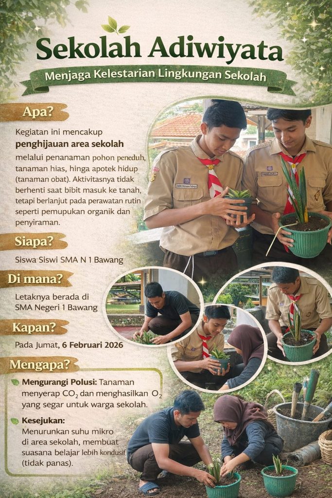 BANJARNEGARA, 6 Februari 2026 – SMA Negeri 1 Bawang, Banjarnegara, terus mengukuhkan perannya dalam pelestarian lingkungan melalui penguatan program Sekolah Adiwiyata. Langkah ini diwujudkan melalui serangkaian aksi nyata yang melibatkan seluruh warga sekolah, mulai dari internalisasi budaya bersih hingga inovasi kreativitas siswa berbasis lingkungan.